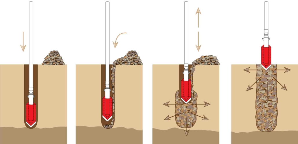 As the probe is withdrawn, the gravel in the cavity displaces the surrounding soil, forming a stone column and compacting the ground. The compaction process is monitored via the control system on the hydraulic power unit.